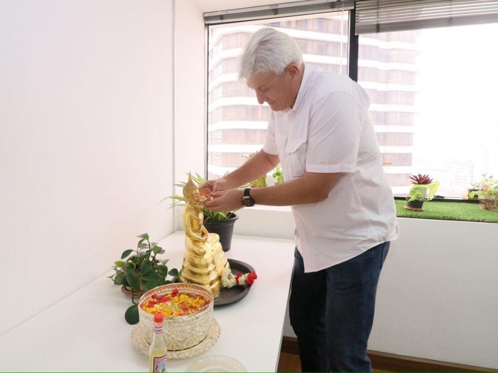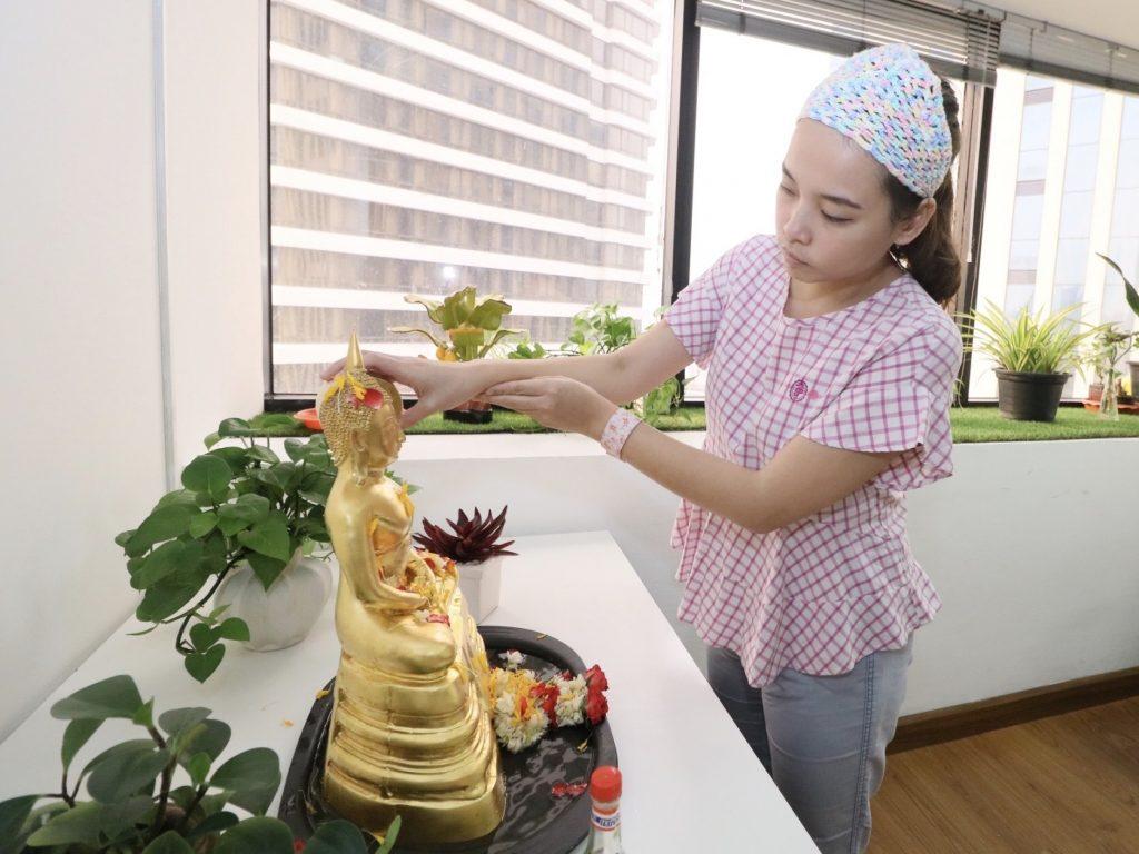 Typical Songkran in Thailand usually celebrate for 3 days with loved ones and families but with unprecedented obstacles that’s happening earlier. We are trying to promote stay in experience to give our staff festive spirit. This year we celebrated in a bit different way by pouring water on Buddha statues one by one in order to give our staff traditionally environment in workplace while they are out for essential work and office errands due to the cancellation of public holidays.
